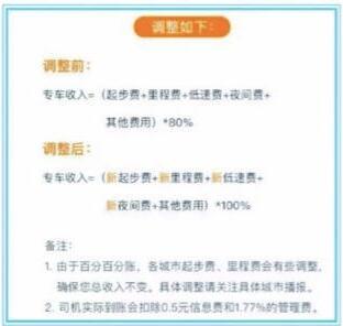 8月22日,济南滴滴专车司机端计费方式开始调整。原来滴滴专车、快车司机的收入模式是:乘客每单支付的车费中,平台抽取20%提成,外加每单0.5元的保险费用,剩余部分归司机所有。计费调整后,平台不再执行“抽成”模式,而是司机和乘客分开计价,直接显示最后运价。