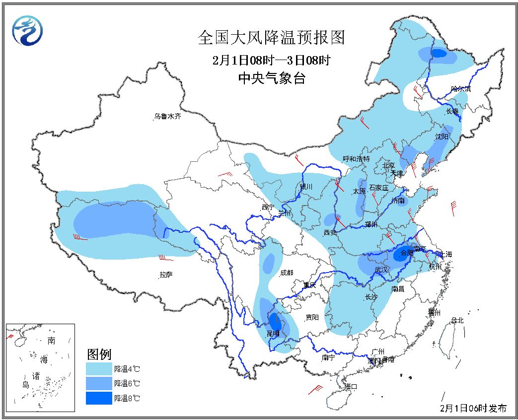 据中央气象台预报,受冷空气影响,2月1日至3日,我国中东部大部地区自北向南将先后出现4~5级偏北风,阵风6~7级;并伴有4~6℃降温,局地可达8℃;5日之前,黄淮及以南地区气温仍将持续偏低2~5℃。东部和南部部分海区有7~8级、阵风9级的偏北风。中央气象台2月1日06时发布大风降温预报。