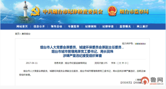 据烟台市纪委消息:烟台市人大常委会原委员、城建环保委员会原副主任委员,烟台市城市管理局原党工委书记、局长田炜涉嫌严重违纪,目前正接受组织审查。
