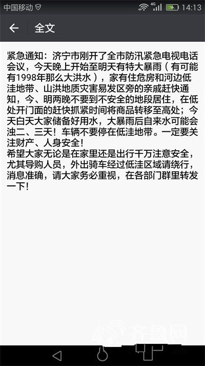 朋友圈传文如下:“紧急通知:济宁市刚开了全市防汛紧急电视电话会议,今天晚上开始至明天有特大暴雨(有可能有1998年那么大洪水),家有住危房和河边低洼地带、山洪地质灾害易发区旁的亲戚赶快通知,今、明两晚不要到不安全的地段居住,在低处开门面的赶快抓紧时间将商品转移至高处;今天白天大家储备好用水,大暴雨后自来水可能会浊二、三天!车辆不要停在低洼地带。一定要关注财产、人身安全!希望大家无论是在家里还是出行千万注意安全,尤其导购人员,外出骑车经过低洼区域请绕行,消息准确,请大家务必重视。”记者通过查证发现,此新闻最早在6月15日前后从黑龙江省牡丹江市流传出来,目前造谣者已被牡丹江警方抓获。