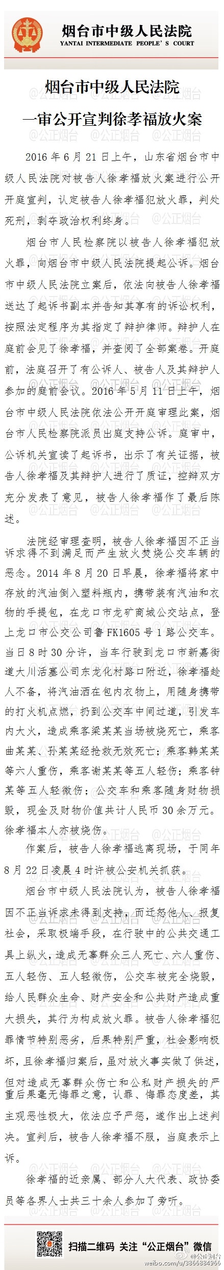 2016年6月21日上午,山东省烟台市中级人民法院对被告人徐孝福放火案进行公开开庭宣判,认定被告人徐孝福犯放火罪,判处死刑,剥夺政治权利终身。