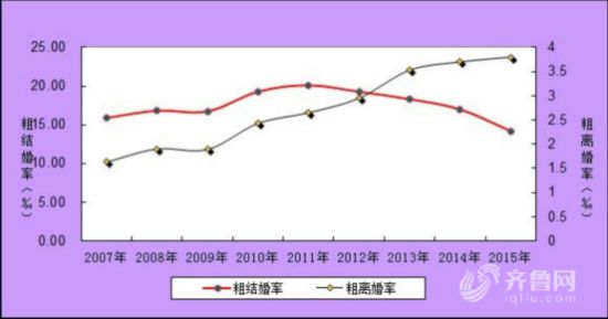日前公布的《2015年山东省民政事业发展统计公报》显示,山东居民粗离婚率(全年离婚人数占全省总人口数的比重)连续上升的同时,粗结婚率在逐年下降。2015年,山东粗离婚率为3.8‰,比2014年增加0.1个千分点;粗结婚率连续第四年下降,为14.2‰,比2014年降低2.79个千分点。