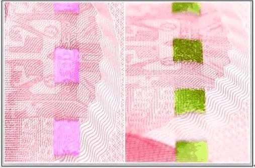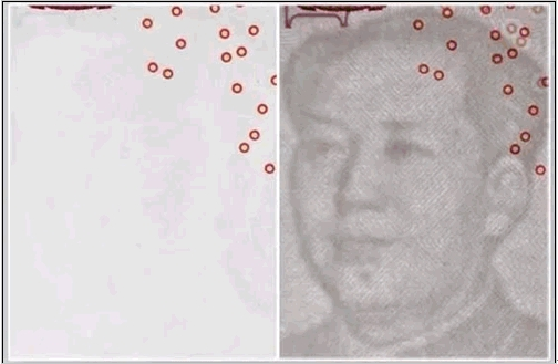 位于票面正面左侧空白处。透光观察,没错毛爷爷头像就出来了。(此项特征大家一定要牢记也要灵活变通,因为现在很多的假币会将此图案直接印在票面)