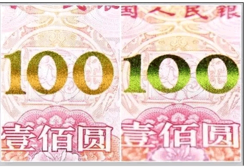 2015年版第五套人民币100元纸币在票面中部印有光彩光变数字。垂直观察票面,数字“100”以金色为主,平视观察,数字“100”以绿色为主。随着观察角度的变化,数字“100”颜色在金色和绿色之间交替变化,并可见到一条亮光带在数字上下滚动。(此项特征明显,建议大家牢记)