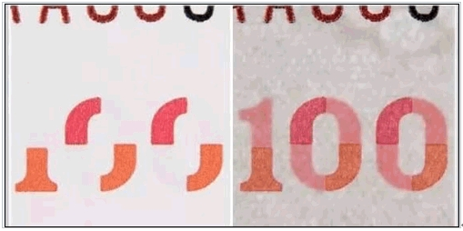 在票面正面左下方和背面右下方均有面额数字“100”的局图案。透光观察,正面背面图案组成一个完整的面额数字“100”