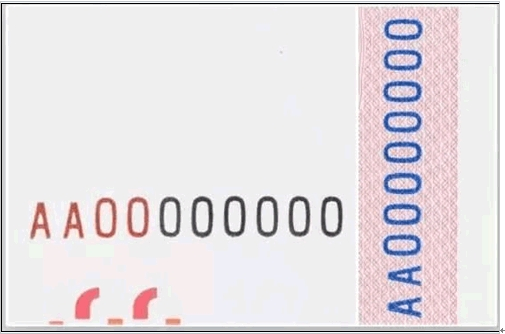 在票面正面左下方采用横号码,其冠字和前两位数字为暗红色,后六位数字为黑色,右侧竖号为蓝色。