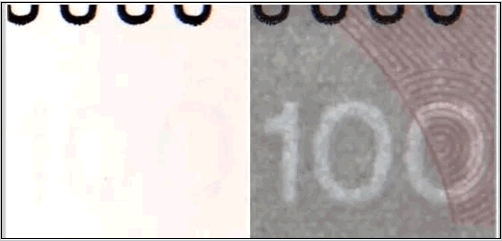 该特征位于票面正面横号码下方。透光观察,可以看到透光性很强的水印面额数字“100”