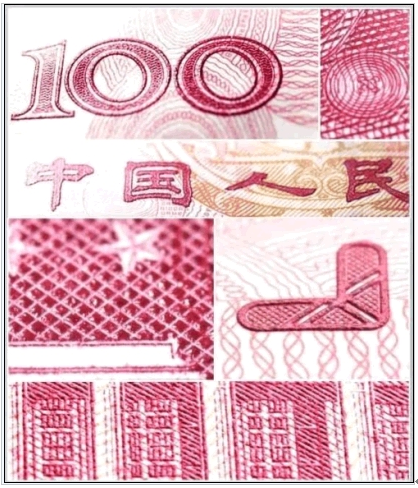 票面正面毛泽东头像、国徽、“中国人民银行”行名、右上角面额数字、盲文及背面人民大会堂等均采用雕刻凹印印刷,用收支触摸有明显的凹凸感。