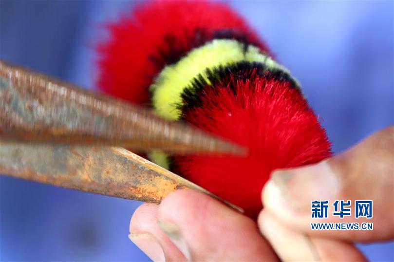它以蚕丝、铜丝和染料为主要原材料,通过手工清洗、上色、劈丝、下条、打花等20多道工序制作而成,形态栩栩如生,十分惹人喜爱。