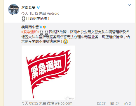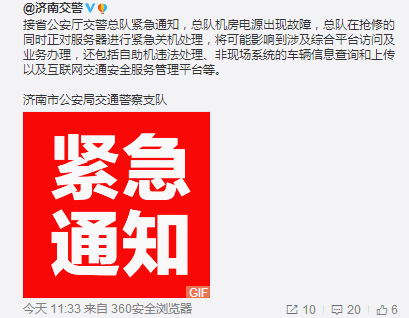 消分、挂牌、驾照考试报名预约……今天,因为山东省交警总队机房故障,各地车管所的网上业务办理全挂掉了!从今天上午9点左右开始,山东全省的车管业务办理都因技术故障而暂停了。根据山东省公安厅交警总队的通知,故障出自机房电源,目前山东省交警总队正在抢修,同时也将服务器紧急关机了。受影响暂时无法处理的业务有,车管所网站的访问及业务办理、交通违法自助处理、非现场系统的车辆信息查询和上传,以及交通安全服务管理平台等。截至今天下午4点记者发稿时,技术维修仍在进行中,具体修复时间仍不确定。另据济南交警官方微博回复网友称,由于系统故障,今天下班前网络无法恢复,临时牌照也暂时无法办理。