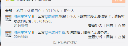 据济南市车管所官微回应,今天下班前网络无法恢复。