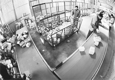 河北秦皇岛海港区临港物流园区一家快递公司内,快递员正在分拣快递包裹