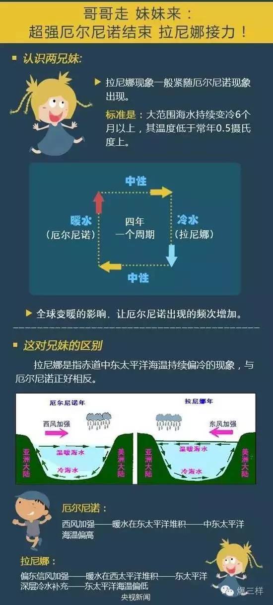 这几年随着全球气候变暖,大家对“厄尔尼诺”都很熟悉了,但这次可能要来的“拉尼娜”又是啥呢?样妹查阅专业资料发现,拉尼娜是西班牙语“La Ni?a”——“小女孩,圣女”的意思,它是指赤道附近东太平洋水温反常下降的一种现象,表现为东太平洋明显变冷,对区域或全球一半以上地区的气候有显著的影响。她是厄尔尼诺现象的反相,兄妹俩通常交替出现,一个是“暖事件”,一个是“冷事件”。