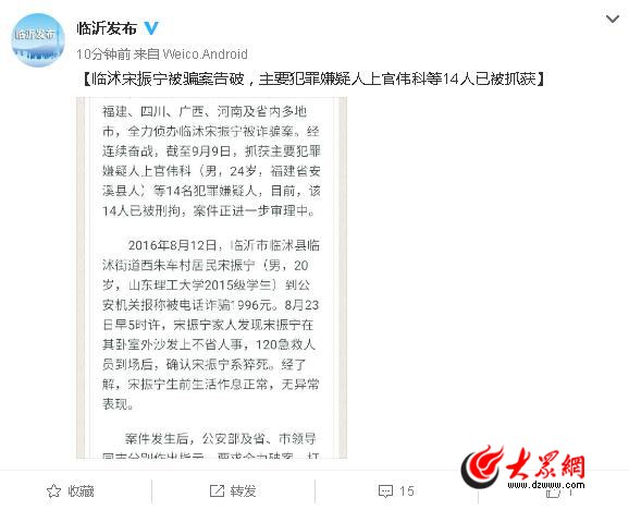 记者从山东省临沂市人民政府新闻办公室官方微博获悉,在公安部、山东省公安厅的统一组织指挥和有关省、市公安机关的支持配合下,临沂市、县公安机关专案组分赴福建、四川、广西、河南及省内多地市,全力侦办临沭宋振宁被诈骗案。经连续奋战,截至9月9日,抓获主要犯罪嫌疑人上官伟科(男,24岁,福建省安溪县人)等14名犯罪嫌疑人,目前,该14人已被刑拘,案件正进一步审理中。