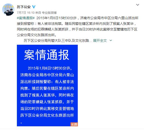 案情通报称,2015年1月8日15时30分许,济南市公安局市中区分局六里山派出所接到报警称:有人被非法拘禁。随后民警在辖区某诊所内找到了报案人张某华,同时将在场的犯罪嫌疑人张某抓获,并于当日20时许将此案移交至管辖地历下区公安分局文化东路派出所。